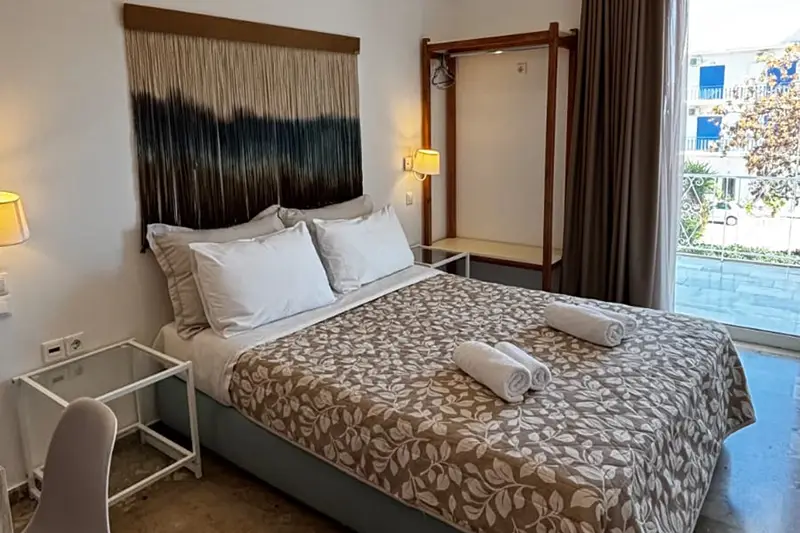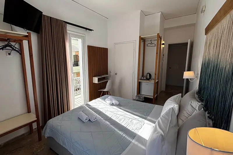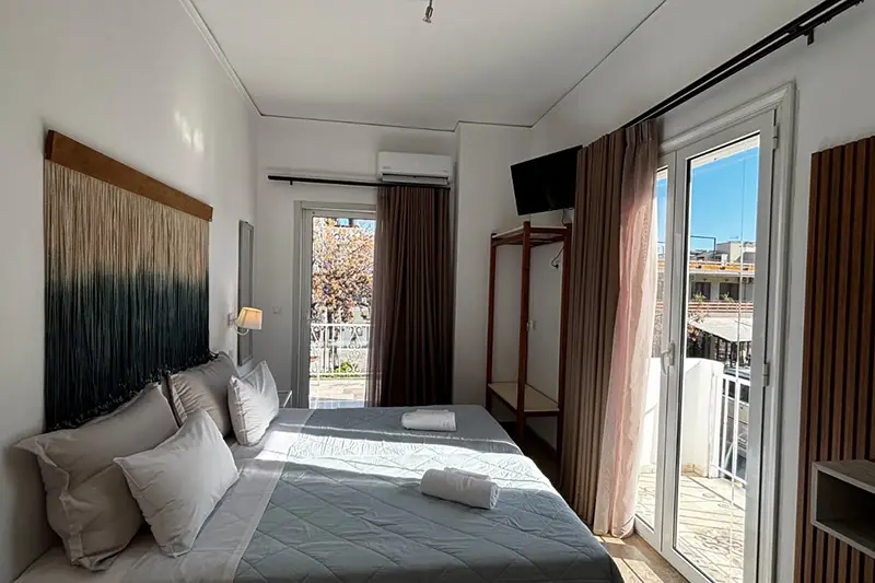 Our Double Rooms in Pitsakis Complex are the latest addition to our accommodation, and have been renovated and decorated with beige and blue tones, providing a calmness to our guests during their stay in Tolo. These spacious Double Rooms are equipped with a double bed or two single beds depending on what better suits your needs, making them ideal for friends or couples. Our rooms are located just a few steps from Tolo beach on foot and close to the village centre offering a great experience for all.